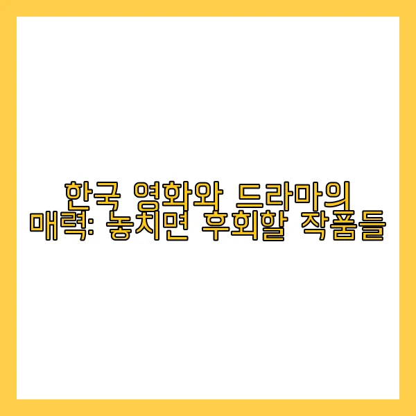 이처럼 한국 영화와 드라마는 다양한 주제와 장르로 많은 이들에게 감동과 여운을 남깁니다. 각 작품들은 문화적 또는 비평적으로 중요한 위치를 차지하고 있어 반드시 시청해보아야 할 필수 리스트입니다. 오늘 소개한 작품들을 통해 한국의 문화적 깊이를 경험해보세요!