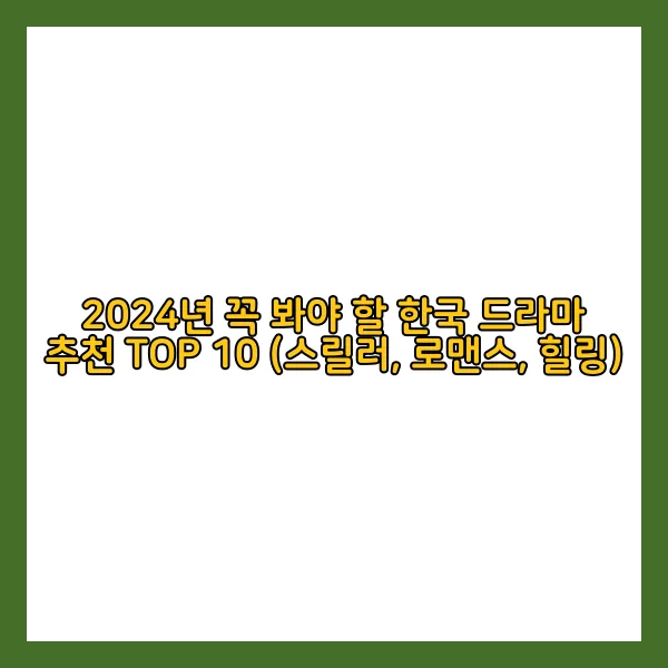 안녕하세요, 드라마 덕후 여러분!😄 최근 쏟아져 나온 2024년 한국 드라마, 정말 눈 돌아갈 만큼 재밌는 작품들이 많았죠?! 그래서 제가 엄선한 TOP 10 리스트를 들고 왔습니다! 스릴 넘치는 서스펜스부터 심장 콩닥거리는 로맨스, 그리고 마음 따뜻해지는 힐링까지… 취향 따라 골라보는 재미가 쏠쏠할 거예요! 자, 그럼 2024년 한국 드라마 명작들을 만나러 가볼까요? ✨